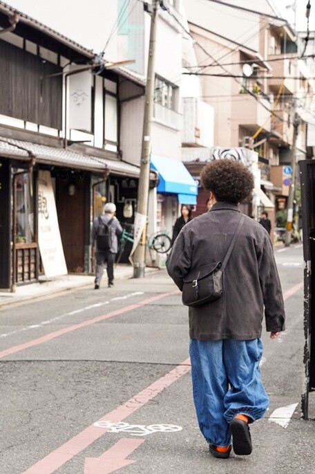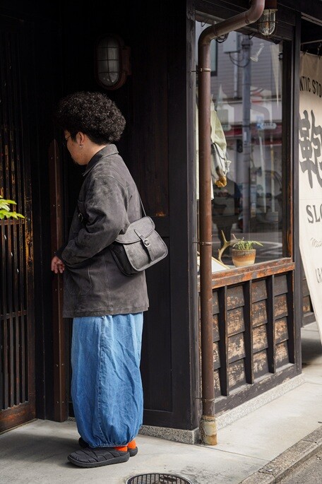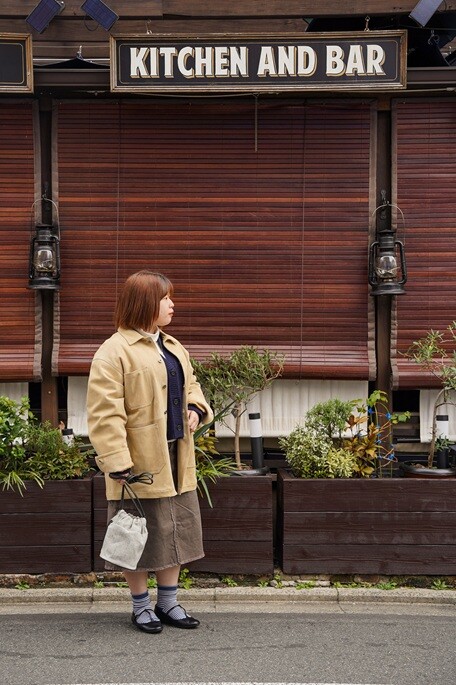 少しラフな巾着バッグも、抜け感があっていい合わせ方です。