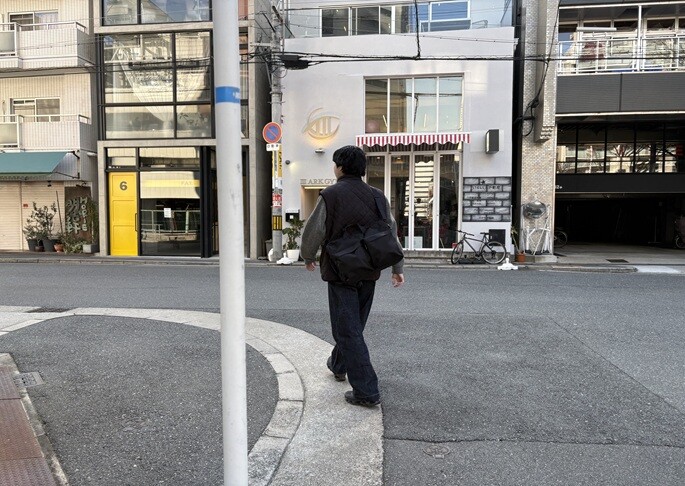 レザーや帆布の生地とは一味違う洗練された雰囲気が大阪の街並みに絶妙にマッチ。