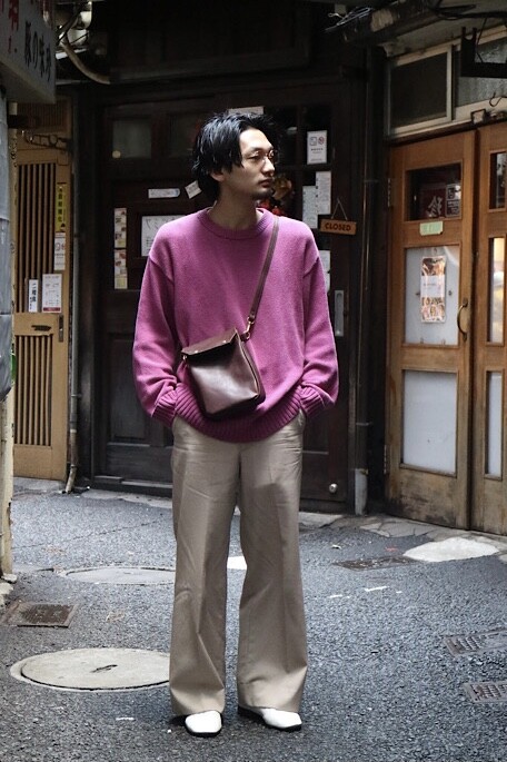 鮮やかなカラーのニットを主役にしたスタイリング。